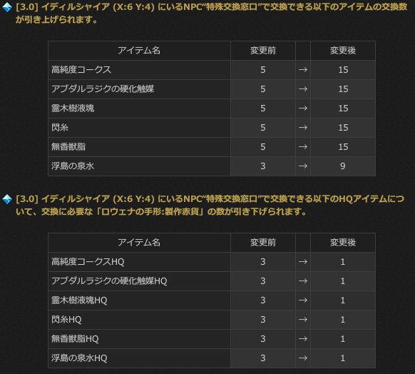 N素材の1個あたりの交換数が3倍、HQ素材の交換コストが1/3になります。